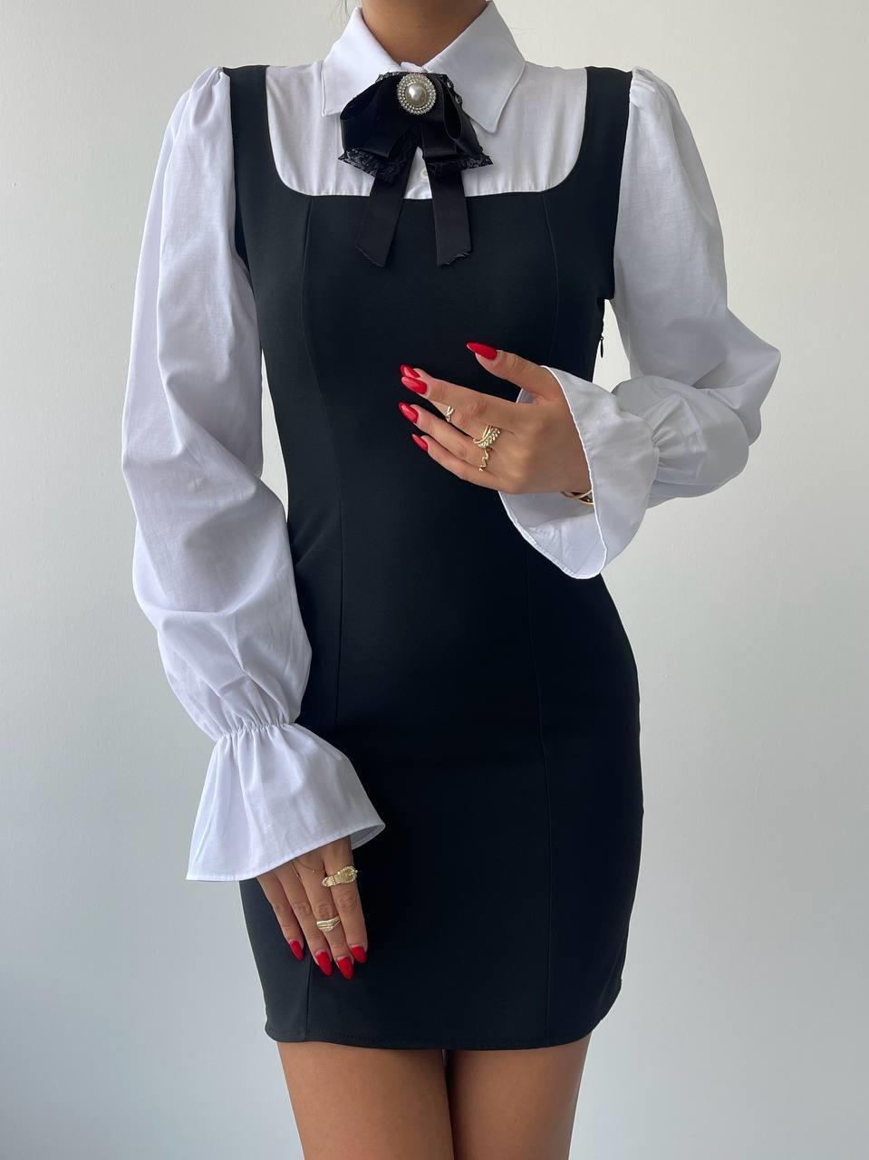İdil Siyah Broşlu Gömlek Yaka Birleşik Elbise (CON6410)
