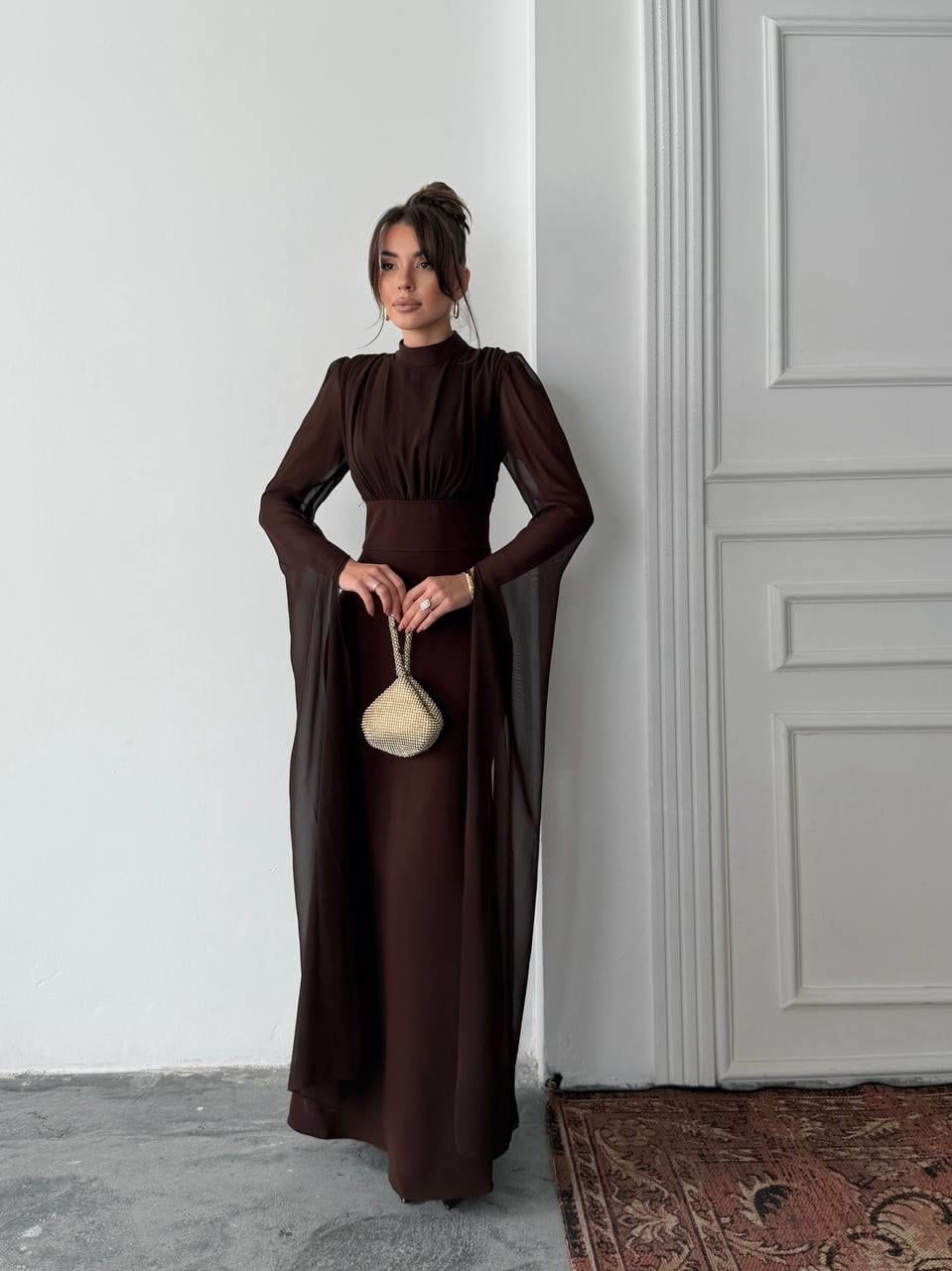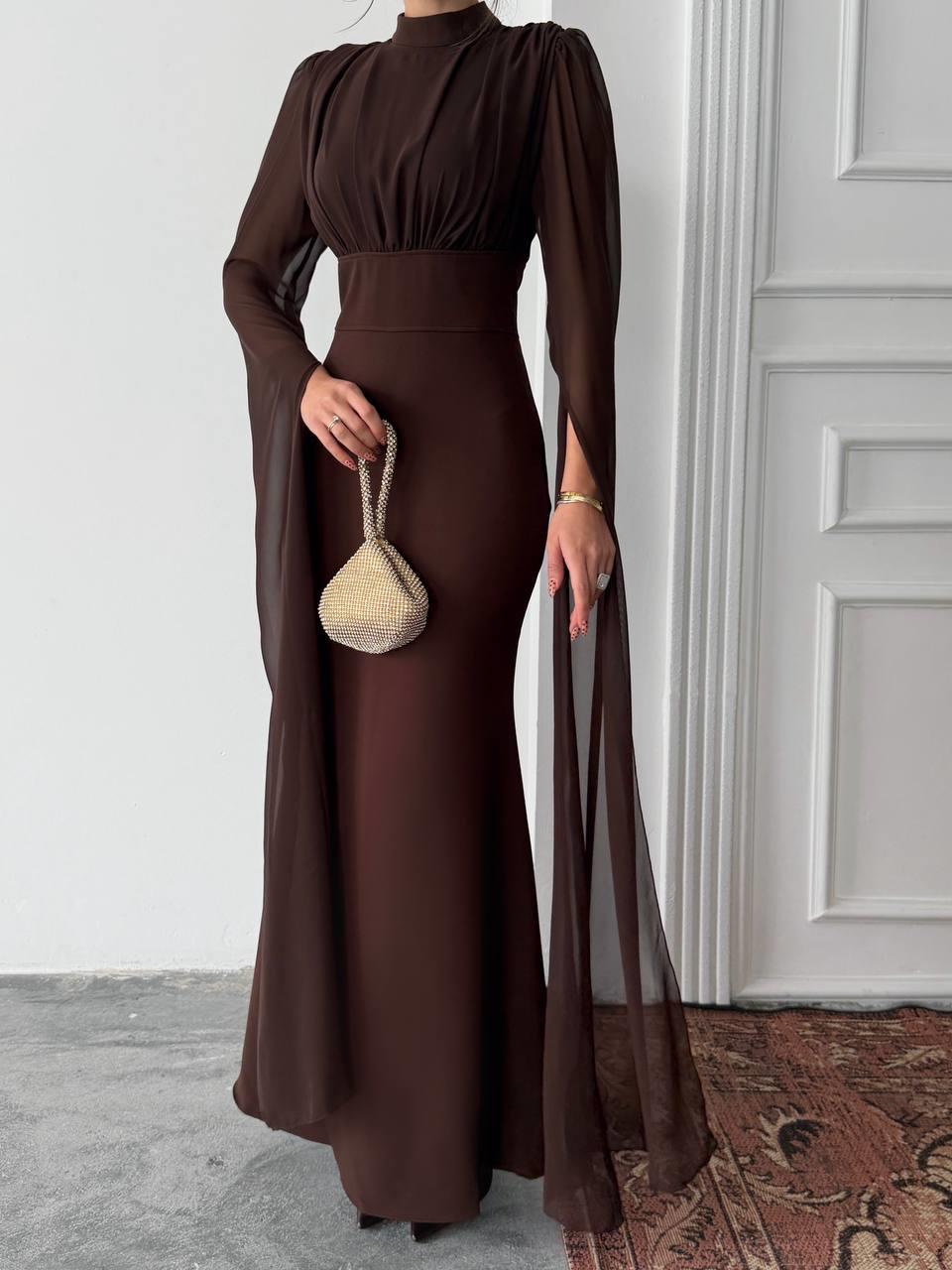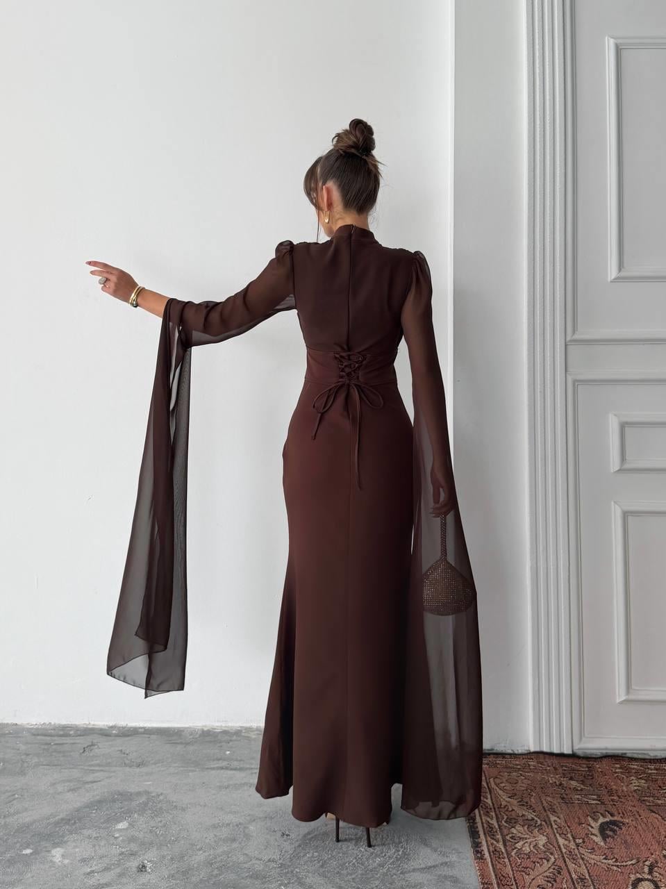 Karen Tül Kol Korsaj Bağlamalı Uzun Elbise (CON6419)