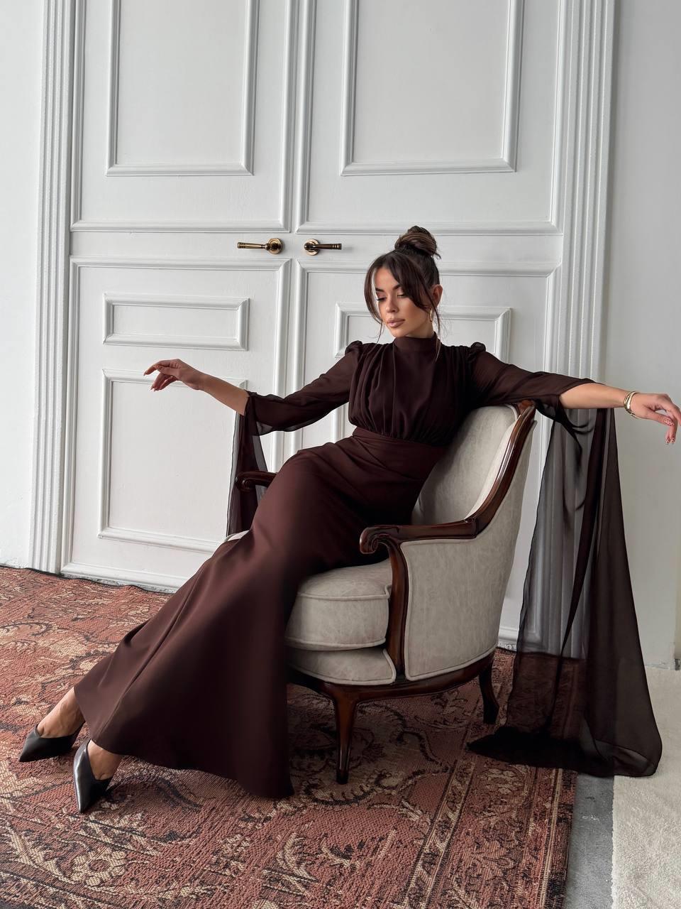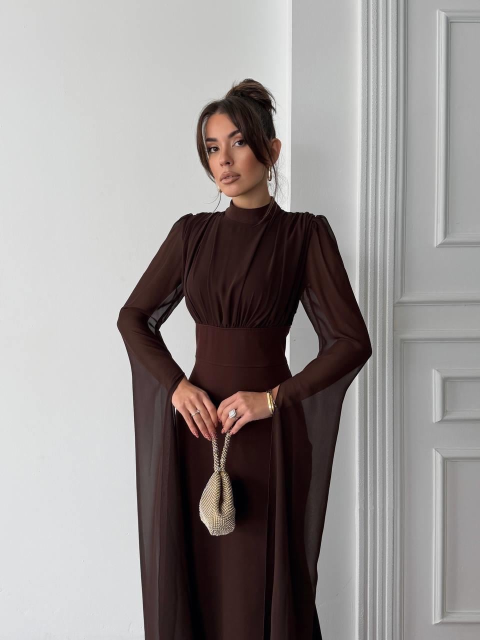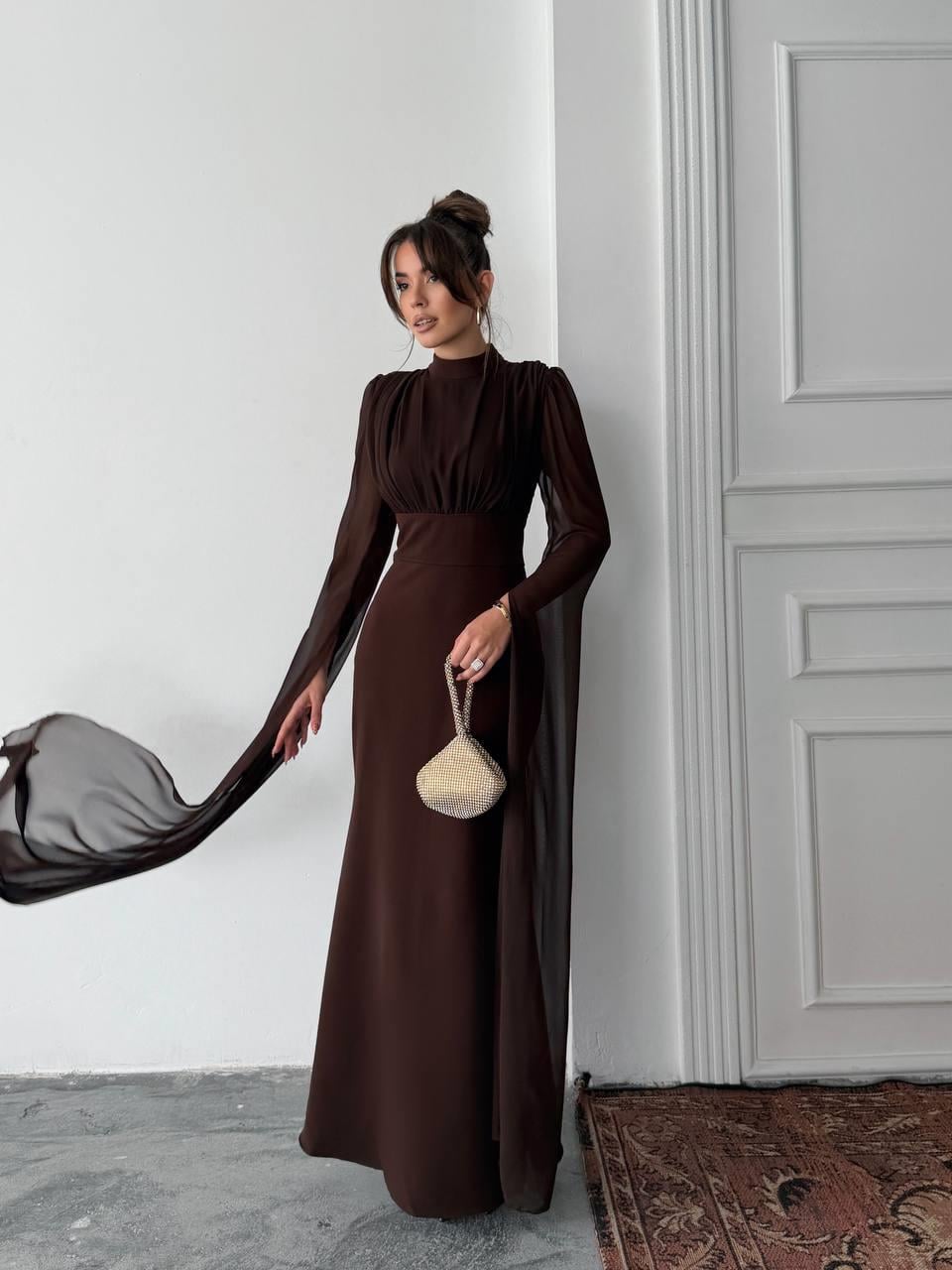 Karen Tül Kol Korsaj Bağlamalı Uzun Elbise (CON6419)