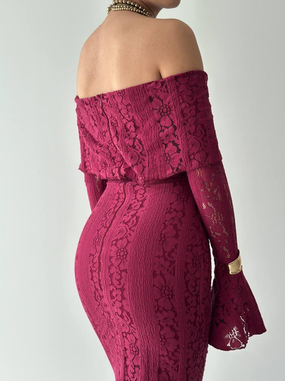 Lumina Dantel Kumaş Açık Omuz Uzun Elbise (CON6357)
