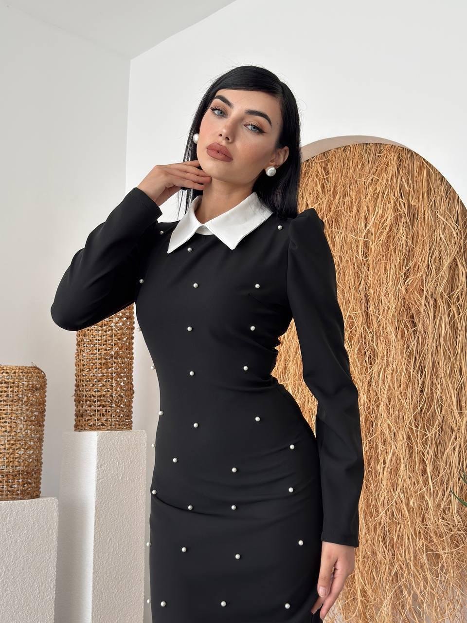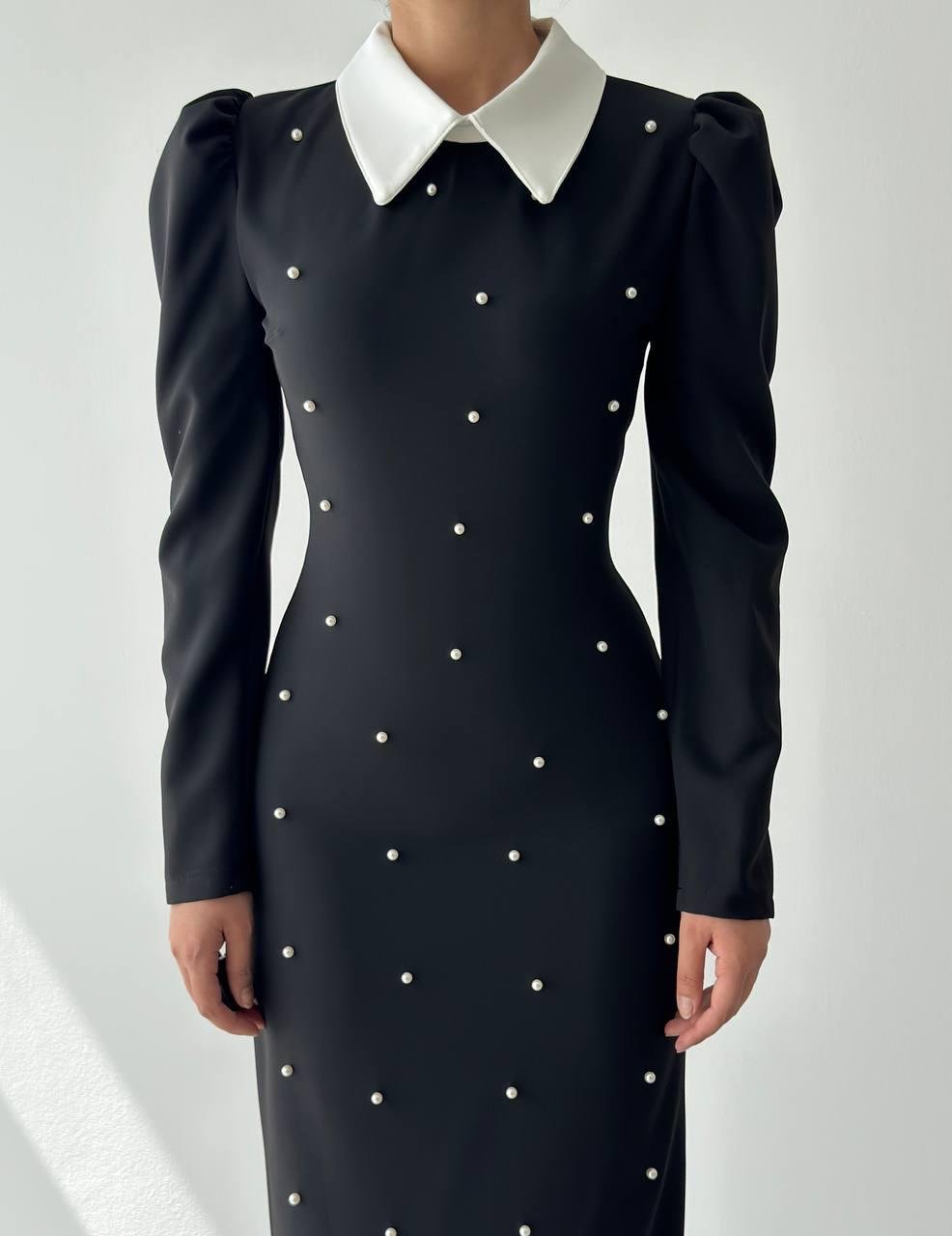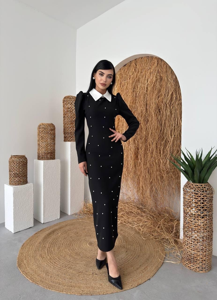 Perlina İnci Boncuk Detay Gömlek Yaka Uzun Elbise (CON6358)