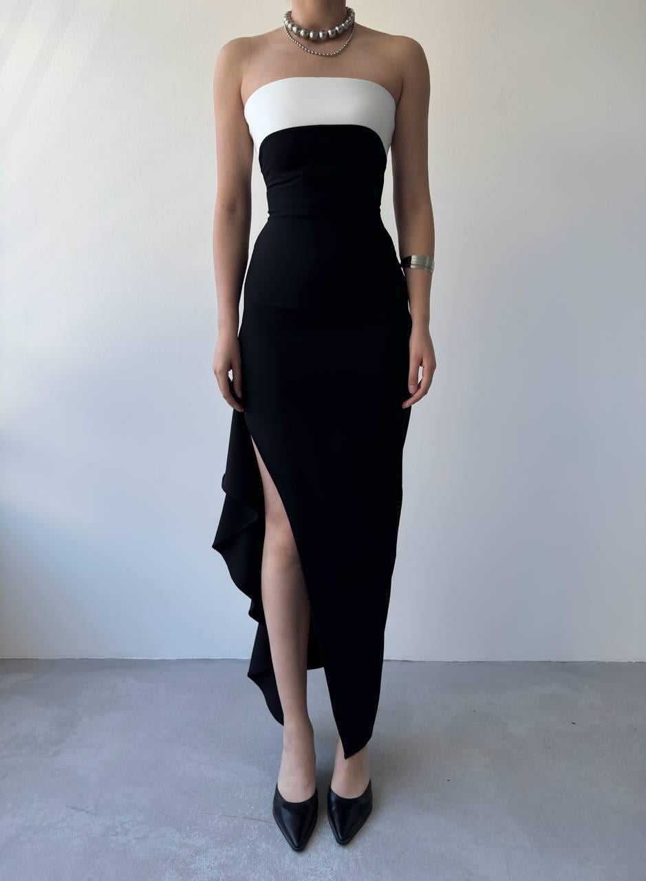 Straplez Yırtmaçlı Atlas Uzun Elbise (CON6539)